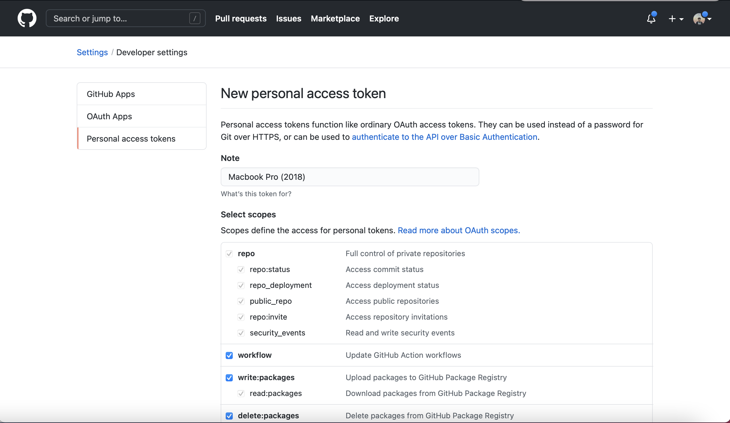 - Note 에 이 키가 어디에서 사용되는지 기록하고 권한 설정을 한 후에, 아래의 Generate token 을 눌러줍니다. 저의 경우는 Macbook Pro (2018) 으로 설정했습니다. 윈도우용 PC가 하나 더 있어서 그렇게 설정했습니다. 컴퓨터가 한대라면 My PC 정도로 Note해도 되겠죠.
